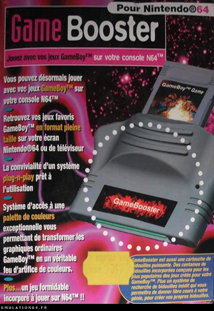 Dossiers et Tutos N64 Par BFrancois - Mai 2012 Liste des Chapitres : 1. Introduction Le GameBooster est un accessoire Nintendo 64 non officiel, commercialisé par DATEL en 1998, et vendu à l'époque une cinquantaine d'euros. Il va vous permettre de jouer à vos jeux GameBoy sur votre console Nintendo 64 (c'est en quelques sortes le "Super GameBoy" de la console 64 bits). Boite française du GameBooster Regardons cet accessoire d'un peu plus près... 2. Présentation de l'accessoire Le GameBooster est de la même taille qu'un jeu Nintendo 64. La grosse différence, c'est qu'il possède deux ports cartouches : un petit sur le dessus, un plus gros sur la face arrière. Mais pourquoi deux ports cartouches ? Parce que le GameBooster est un accessoire non officiel, de ce fait vous aurez besoin d'une cartouche Nintendo 64 pour faire fonctionner votre jeu GameBoy. Les jeux GameBoy s'insèrent sur le dessus, les jeux Nintendo 64 sur la face arrière. En plus de faire fonctionner vos jeux GameBoy sur Nintendo 64, le GameBooster va vous permettre : - de modifier l'apparence des jeux GameBoy - de tricher - de sauvegarder - de jouer à "Rebound : Mission" Le GameBooster est compatible avec la majorité des jeux GameBoy (il utilise l'émulation pour les faire fonctionner). Voici une vidéo vous présentant l'accessoire : Présentation du GameBooster (Vidéo) 3. Modifier l'apparence des vos jeux Une fois le jeu lancé, vous pourrez modifier son apparence. Pour cela, appuyez sur les touches L et R de votre manette pour faire apparaitre le menu. Menu du GameBooster Les 3 icones qui nous intéressent sont celles-là : ![]() 1) La première icone permet de basculer le jeu en plein écran. ![]() Super Mario Land - Affichage normal ![]() Super Mario Land - Plein écran 2) La seconde icone permet de changer la bordure du jeu. Pour éviter de jouer avec un fond noir, le Gamebooster vous propose de choisir parmi plusieurs bordures. Les jeux GameBoy les plus récents (sortis après le Super GameBoy) possèdent leur propre bordure. Elle s'affichera directement en lançant le jeu, mais vous pourrez toujours la remplacer par celles proposées par le GameBooster. ![]() Super Mario Land - Affichage avec bordure 3) La dernière icone permet de changer les couleurs du jeu. Le GameBooster vous permet de modifier la palette de couleur de l'ensemble des jeux GameBoy. Les jeux GameBoy les plus récents (sortis après le Super GameBoy) possèdent des informations pour afficher le jeu en couleur. La palette de couleurs se chargera directement lançant le jeu, mais vous pourrez toujours la modifier par la suite si les couleurs ne vous plaisent pas. Modifier les couleurs ![]() Rebound : Mission - Palette de couleurs modifiée Voici 2 vidéos vous montrant les possibilités du GameBooster : GameBooster - Rebound Mission (Vidéo) GameBooster - Super Mario Land (Vidéo) 4. Vive la triche ! Le GameBooster vous propose deux façons pour tricher dans vos jeux GameBoy, grâce au mode "Cheats" et au mode "Trainer". Menu du GameBooster 1) Cheats : C'est le mode le plus facile à utiliser. Il va vous permettre de tricher sur une centaine de jeux GameBoy. Avec de la chance, vous trouverez votre jeu GameBoy dans la liste, et pourrez activer un ou plusieurs cheats. Listes de jeux avec cheats Voici un exemple avec le jeu "Bugs Bunny" : GameBooster - Bugs Bunny (Vidéo) 2) Trainer : Ce mode est un peu plus complexe. L'accessoire vous donne les outils pour comparer plusieurs save states (images du jeu dans la mémoire), afin de trouver des cheats par vous mêmes. Si vous aimez bidouiller, ce mode est fait pour vous ;) 5. Comment sauvegarder ? Le GameBooster ne possède pas de pile pour sauvegarder des données, donc oubliez les sauvegardes rapides. Comment fait-on alors pour sauvegarder ? Et bien, l'accessoire sauvegarde directement dans la cartouche du jeu comme peut le faire la GameBoy (à condition que le jeu possède une pile de sauvegarde). Vous pourrez ainsi commencer une partie sur la console portable, puis reprendre le jeu sur votre Nintendo 64. Si le jeu ne possède pas de pile pour sauvegarder, il vous sera impossible de sauvegarder votre progression. Dans ce cas, les jeux GameBoy utilisent généralement des codes pour charger le niveau sur lequel vous vous étiez arrêtés. Intro du GameBooster 6. Chouette, un jeu inclus ! Le GameBooster contient également un jeu : "Rebound : Mission". Pour le lancer, il suffit de retirer la cartouche GameBoy (un jeu Nintendo 64 est cependant nécessaire). "Rebound : Mission" se chargera automatique en couleur et avec sa propre bordure : ![]() Rebound Mission "Rebound : Mission" est en fait une version legèrement modifiée du jeu "POKE Mission 97" (jeu amateur Gameboy) développé par Anders Granlund en 1997. Rien à voir donc avec les jeux GameBoy que vous pouvez trouver dans le commerce ! L'objectif de "Rebound : Mission" est simple : il faut envoyer des balles sur une plateforme en mouvement sans se faire toucher. Le jeu est marrant cinq minutes, mais devient très vite lassant... Sur la boite de l'accessoire, DATEL a quand même osé décrire ce jeu comme "Formidable" ;) Voir : GameBooster - Rebound Mission (Vidéo) 7. Oui, mais... Sur le papier, ce GameBooster a tout pour plaire, mais vous allez vite vous rendre compte que cet accessoire n'a pas que des qualités. Le plus gros défaut, c'est la partie audio. Aussi surprenant que cela puisse paraître, le GameBooster n'émule pas ni le son, ni les musiques de vos jeux GameBoy. C'est quand même un comble pour un accessoire qui se veut être le "Super Gameboy" de la Nintendo 64. Pire encore, DATEL a remplacé cette absence audio par une musique énervante, jouée en boucle, et impossible à arrêter. Seul moyen pour soulager vos oreilles, couper le son de la télé ! Ecoutez cette musique, elle rend dingue : GameBooster - Tetris (Vidéo) Autre problème, son compatibilité. Tout comme le "Super GameBoy" de la Super Nintendo, le GameBooster n