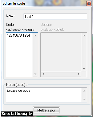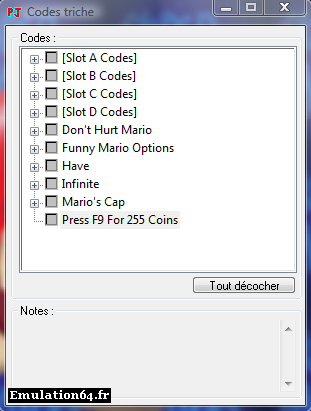 Dossiers et Tutos N64 Par Hypernono - Décembre 2008 Liste des Chapitres : 1. Introduction Cette aide va vous apprendre à utiliser des codes triches dans vos jeux pour avoir des vies infinies, munitions infinies et à rajouter vos propres codes triches sous project64. 2. Utiliser des Codes Triches Les codes triches de project64 sont tous regroupés dans un fichier nommé « Project64.cht » modifiable avec un logiciel de traitement de texte, mais les auteurs de Project64 ont préféré vous faciliter la tache en incluant un éditeur de codes triches directement. Pour y accéder, il suffit de lancer un jeu puis de cliquer sur le menu «système » puis «codes triches », vous accéderez ainsi a la liste des codes triches disponible pour ce jeu. La liste des codes triches pour Super Mario 64 Pour utiliser les codes triches il suffit de cocher les codes désirés puis de fermer la fenêtre. Attention : Certains codes triches nécessitent de redémarrer la rom, d'autres ont besoin d'être activés grâce a un bouton accessible en cliquant sur « système » puis « bouton triches » ou en appuyant sur F9 de votre clavier. Si tel est le cas une note en bas de la fenêtre vous avertira (en Anglais). 3. Gestion des Codes Triches Utiliser les codes triches c'est bien, mais en créer c'est mieux. Heureusement que l'éditeur de codes triches est encore la pour nous aider. Tout d'abord, allez dans « Options » puis « Réglages... », décochez « Cacher les options avancées » puis validez. Pour rajouter un code triches il faut ouvrir la fenêtre de codes triches et faire un clic droit sur un partie vide de la fenêtre et de sélectionner « Ajouter un nouveau code ». Une nouvelle fenêtre apparait permettant de choisir le nom du code triche, le code triche correspondant ainsi qu'une note expliquant son fonctionnement. Si le code triche entré est valide, l'option « Ajouter un code » apparait pour valide le code triche. L'option « Nouveau code » permet de vider la fenêtre pour retaper entièrement le code triche. Je rajoute un code triche Attention : Le code triche doit être écrit en hexadécimal et comporté une série de huit numéros ou lettres suivit d'une autre série de quatre. Des codes triches sont disponibles un peu partout sur internet pour vous donner un exemple et vous permettre de les rajouter. Vous venez de rajouter votre nouveau code triche mais vous vous êtes aperçu que vous vous êtes trompé en l'écrivant ? Rien de grave, vous pouvez le modifier a tout moment en faisant un clique-droit dessus le code triche a modifier et en sélectionnant l'option « Editer ». Je modifie mon code triche Vous pouvez aussi supprimer un code simplement. Il faut pour cela faire un clic-droit sur le code triche a supprimer et sélectionner «Supprimer ». Cette option est irréversible et la fenêtre confirmant votre choix sera la pour vous le rappeler. 4. Conclusion Vous savez maintenant utiliser les codes triches disponibles dans project64 ainsi que rajouter vos propres codes triches. Vidéos Tuto-Vidéo : Utiliser les Codes Triches avec Project64 |