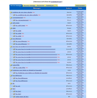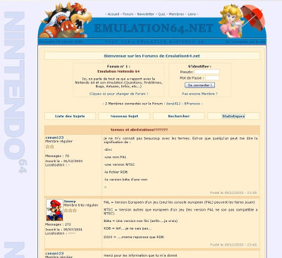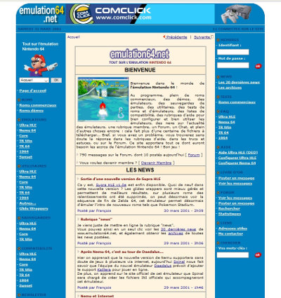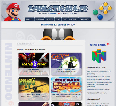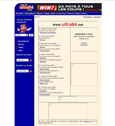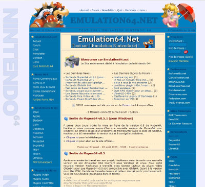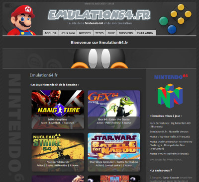 Dossiers et Tutos N64 Par BFrancois - Mars 2010 (Mis à jour en Juin 2023) Liste des Chapitres : 1. Introduction L'aventure de l'émulation Nintendo 64 a commencé pour moi en 1999, à la sortie de UltraHLE (1er émulateur à faire tourner des Roms N64 commerciaux). Emulation64.fr n'est pas né tout de suite, plusieurs sites internet se sont succédés. Je vais vous les présenter à travers ce dossier... 2. 1999 - Nintendo64.free.fr UltraHLE sort en 1999, c'est le permier émulateur qui permet de jouer à des Roms N64 commerciaux. Etant fan de la Nintendo 64, je décide de créer une page perso chez Free parlant de l'émulation N64 : Nintendo64.free.fr. Je proposais à l'époque des informations et des liens pour télécharger des Roms et des Emulateurs Nintendo 64. Aujourd'hui, le compte existe toujours, il me permet de stocker certains fichiers pour le Site. Nintendo64.free.fr (début 2000) 3. 2000 - Ultra64.net En 2000, je suis tombé sur un site américain permettant d'avoir pendant un an un nom de domaine gratuit. Je saute sur l'occasion, et choisis : Ultra64.net N'ayant pas d'hébergement pro, le nom de domaine renvoie vers un de mes autres comptes Free : Emulation64.free.fr C'est à ce moment que je crée le premier design bleu et orange du site, avec un seul menu à gauche. Le site s'est un peu étophé avec des rubriques d'aides pour configurer les émulateurs, quelques tests rapides de Roms, et un Forum. Ultra64.net (février 2001) 4. 2001 - Emulation64.net En 2001, le nom de domaine Ultra64.net arrive à échéance. Il est ainsi repris par son propriétaire (un site américain) qui y met de la pub pour rentabiliser l'achat. Je décide donc d'acheter un nom de domaine et un hébergement pro à mon nom cette fois-ci : Emulation64.net est né. Je reprends le design de Ultra64.net que je modifie (ajout d'un 2ème menu à droite). De nouvelles rubriques font leur apparation : Utilitaires, Quiz, Sauvegardes de Jeu, Listes de Compatibilités, etc... Par contre, le Site ne propose plus de Roms N64 Commerciaux. Les premiers Quiz présents sur Emulation64.fr viennent d'Emulation64.Net ;) Etant étudiant à l'époque, je suis obligé d'inscrire Emulation64.net dans une régie publicitaire pour pouvoir payer les frais d'hébergement du site. Emulation64.net (mars 2001) Ultra64.net (Le Forum (avril 2001)) Syquest me rejoint à la tête de Emulation64.net en 2004. De nouveaux membres actifs sont nommés Newsers et/ou Modérateurs pour nous aider dans notre travail. Emulation64.net héberge plusieurs sites, les plus connus sont : - Nono64 : un site créé par Hypernono proposant des Fichiers et des Tutos pour Project64. - Le dernier Recours (The Company) : Le miroir officiel français du site de SupraHLE/The Company. N'ayant plus le temps de m'occuper du site, Syquest reprend le site en 2005. Emulation64.net (octobre 2005) Le Forum (janvier 2004) En 2006, le site s'arrête (provisoirement), car tout comme moi, Syquest n'a plus de temps de s'en occuper... Laurent (fondateur de Mondemul.net, et ancien webmasteur de Snes-fr.com) tente tout de même de récupérer le nom de domaine en 2006 pour maintenir le site en ligne, mais son nouveau propriétaire (une boite qui l'a racheté pour y mettre de la publicité) lui demande des centaines de dollars pour le récupérer. 5. 2008 - Emulation64.fr En 2007, j'essaye de récupérer le nom de domaine Emulation64.net, mais son propriétaire le renouvelle pour un an. Je décide d'attendre 2008, et de profiter de cette attente pour améliorer et recoder entièrement le site. En 2008 j'essaye de nouveau de le récupérer, mais tout comme en 2007, le nom de domaine est encore renouvelé pour un an. Le site étant prêt à être mis en ligne, je décide donc d'acheter le nom de domaine Emulation64.fr en attendant de pouvoir récupérer Emulation64.net. Grâce à une sauvegarde de Syquest, je récupère toutes les données de Emulation64.net sauf pour le forum et les membres. Il faut donc repartir de Zéro, car personne ne connait le site... Petit à petit, l'équipe de Emulation64.fr s'agrandit : D'abord Hypernono, ensuite Magnio, et enfin Olex. Des anciens membres redécouvrent le site sous sa nouvelle adresse. De nouvelles rubriques font leur apparation (notices, vidéos, jeu en réseau, tournois, concours, tests, textures HD, etc...) et la publicité a été bannie ;) Emulation64.fr (mars 2010) Mise à jour du 17/04/2010 : Depuis avril 2010, le contenu de Emulation64.fr est également accessible depuis le site www.ultra64.net. Ultra64.net vous propose un désign alternatif, inspiré de la première version du site en 2000. Design de Ultra64.net (Mai 2010) Mise à jour du 29/10/2010 : Nouveaux designs pour le site en octobre 2010, les visiteurs peuvent choisir entre 6 thèmes : - Classic - ClearGreen - ClearRed - ClearPurple - ClearBlack (par défaut) - Original (ancien design) Designs de Emulation64.fr (Novembre 2010) Mise à jour du 21/10/2013 : Emulation64.fr se dote d'un nouveau design en Octobre 2013. Les menus latéraux ont été allégés afin d'améliorer la navigation et de mettre en avant le contenu de certaines rubriques (Dossiers, Tutos, Tests, Notices). Les anciens thèmes restent bien évidemment disponibles. Design de Emulation64.fr (Octobre 2013) Mise à jour du 06/06/2016 : La plupart des pages ont été recodées et optimisées pour un thème unique. Les anciens thèmes du site qui étaient très peu utilisés par les visiteurs ont été désactivés. Mise à jour du 01/08/2023 : Une nouvelle version "allégée" du site a du être codée en urgence afin de le rendre compatible avec la dernière version de PHP. Le Design a également été changé : Design de Emulation64.fr - Thème Clair (Aout 2023) Design de Emulation64.fr - Thème Sombre (Aout 2023) 6. Conclusion Maintenant vous savez tout, l'histoire de Emulation64.fr n'a plus de secret pour vous ;) Je suis désolé pour les images manquantes dans les captures d'écran des anciennes ve