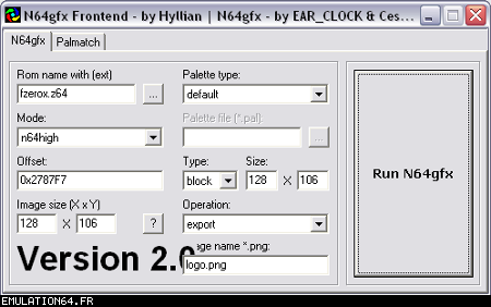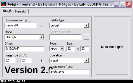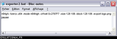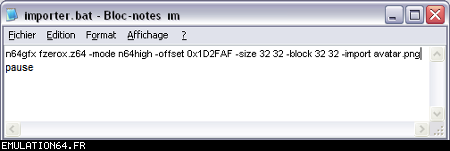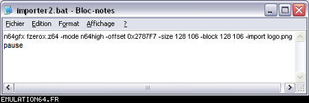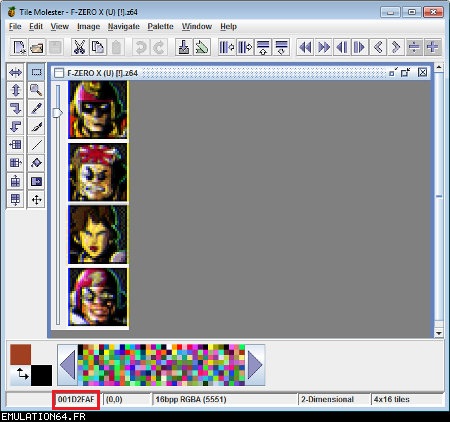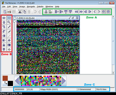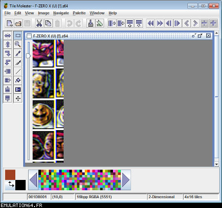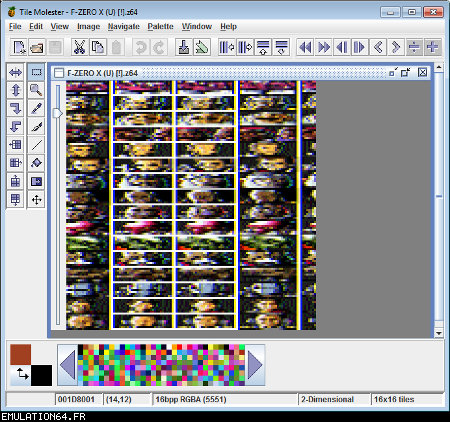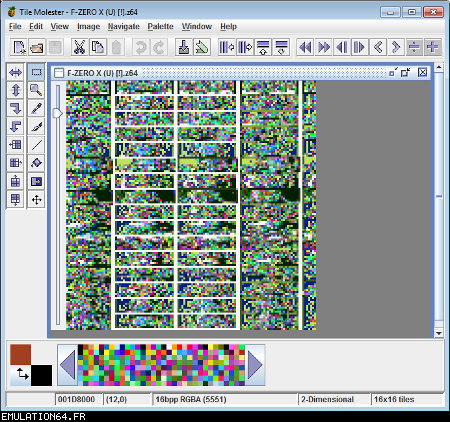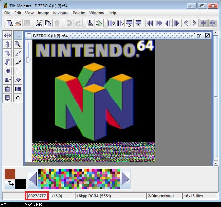 Dossiers et Tutos N64 Par BFrancois - Juin 2012 Liste des Chapitres : 1. Introduction Dans les précédents dossiers, nous avons vu qu'il était possible de modifier les textures des Roms N64 en passant par des plugins (RiceVideo par exemple). Cette méthode permettait de créer/charger des textures HD sans modifier le Rom, tout le travail étant fait par le plugin. De ce fait, il était impossible de jouer avec de nouvelles textures avec d'autres plugins ou directement sur la Nintendo 64. La solution serait de modifier les Gfx directement dans le Rom... Nous allons donc voir étape par étape comment cela est possible en modifiant ensemble quelques Gfx du Rom F-Zero-X. 2. Pré-requis Pour modifier les Gfx des vos Roms N64, vous aurez besoin de : - Gimp (ou autre logiciel de dessin) : Modifier les gfx - Tile Molester : Identifier les Gfx - N64Gfx : Importer et exporter les Gfx du Rom - Real N64 CRC Tool : Modifier le Cheksum du rom - D'un rom N64 (nous utiliserons dans ce tuto le Rom américain : "F-ZERO X (U) [!]") Attention, N64gfx risque de vous poser problème : - L'utilitaire ne fonctionne pas avec les versions 64 bits de Windows. - Le frontend qui accompagne N64gfx sera sûrement identifié comme un fichier dangereux par votre antivirus. 3. Identifier les Gfx Première étape, nous allons essayer d'identifier des Gfx de F-Zero que nous voulons modifier : - L'avatar de Captain Falcon - Le logo N64 (celui de l'intro) Lancez Tile Molester (double-cliquez sur le fichier "tm.bat") et charger le Rom "F-ZERO X (U) [!].z64" : ![]() Le contenu du Rom s'affiche alors dans la fenêtre de Tile Molester. L'application reconnaît les roms N64, il chargera donc automatiquement le bon Codec et le bon Mode pour afficher les Gfx. Pour sélectionner le Codec manuellement, allez dans "View" puis "Codec", et choisissez "16bpp TGBA (5551)". Pour sélectionner le Mode manuellement, allez dans "View" puis "Mode", et choisissez "2-Dimentional". Pour zoomer/dé-zoomer, allez dans "View" puis "Zoom". ![]() Zone A : Ces outils permettent de naviguer dans le Rom Zone B : Ces outils permettent de modifier les Gfx, mais je vous déconseille fortement d'y toucher car l'éditeur de Tile Molester est mal fichu (de toute manière, nous n'en aurons pas besoin car nous allons utiliser N64gfx) Zone C : Informations diverses Les outils (de la Zone A) : ![]() La première icone permet d'aller à un point précis dans le Rom en entrant une adresse (Offset). La seconde permet d'enregistrer plusieurs adresses. ![]() Permet de modifier l'affichage, c'est à dire le nombre de tiles affichés à l'écran en largeur et en hauteur (dans Tile molester, 1 tile = 1 bloc de 8x8 pixels). Indispensable pour bien afficher un gfx. ![]() Permet de faire défiler le contenu du Rom (raccourcis clavier : Touches "Page Suivante" / "Page Précédente") ![]() Affiche les 8 lignes suivantes/précédentes (raccourcis clavier : Touches "Bas" / "Haut") ![]() Affiche les 8 pixels suivants/précédents (raccourcis clavier : Touches "Droite" /"Gauche") ![]() Avancer/reculer d'un octet (byte). Attention, il faut avancer de 2 octets pour avancer d'un pixel. Avancer d'un octet modifiera la palette de couleurs des Gfx. (raccourcis clavier : Touches "+" / " -") Les informations (de la Zone C) : ![]() 002787F9 : indique l'endroit de la rom où nous nous trouvons (Offset). (2,0) : indique le tile qui se trouve sous la souris (x,y) 16bpp TGBA (5551) : indique le Codec utilisé (sélectionné automatiquement par Tile Molester) 2-Dimentional : indique le mode utilisé (sélectionné automatiquement par Tile Molester) 16x16 : indique la taille en tile de la fenêtre (16 tiles = 128 pixels) A la recherche de l'avatar de Captain Falcon : Maintenant que vous savez à quoi servent les outils, nous allons parcourir le Rom. Nous resterons sur l'affichage par défaut : 16x16 tiles. Parcourez le contenu du rom en utilisant la touche "Page Suivante". Vous allez apercevoir plusieurs Gfx qui s'affichent mal, c'est normal ;) Pour accéder à la section qui nous intéresse, appuyez 59 fois sur la touche "Page Suivante". Si vous êtes perdu, allez à l'Offset "001D8000" en cliquant sur la première icône de ce bloc d'outils : ![]() ![]() Les gfx ne s'affiche pas avec la bonne couleur, appuyez donc sur la touche "+" pour avancer d'un octet. Miracle ! Ça ressemble un peu plus à quelque chose. Reconnaissez-vous les avatars des pilotes ? ^^ ![]() Les gfx s'affichent mal car nous sommes en affichage 16x16 tiles (128x128 pixel). C'est normal car les avatars ont une largeur inférieure. Pour modifier l'affichage, utilisez les outils : ![]() En mettant l'affichage en 4x16 tiles, les avatars sont désormais de bonne taille : ![]() L'avatar qui nous intéresse est celui de Captain Falcon. Utilisez les touches "Haut" / "bas" pour le localiser (il se trouve vers le haut). Utilisez ensuite les touches "Gauche" / "Droite" et "+" / "-" pour bien caler l'avatar en haut à gauche de l'écran. Si vous êtes perdu, allez à l'Offset "001D2FAF" en cliquant sur la première icône de ce bloc d'outils : ![]() ![]() Notre Gfx est maintenant identifié, et il se trouve à l'Offset "001D2FAF" (c'est marqué en bas dans la Zone C). A la recherche du logo N64 : Repassez l'affichage en 16x16 tiles grâce aux outils : ![]() Puis continuez à parcourir le Rom avec la touche "Page Suivante". Au bout d'une 20aine de pages, vous allez tomber sur un gros logo N64. Comme tout à l'heure, utilisez les flèches et +/- pour bien le caler. Si vous êtes perdu, allez à l'Offset "002787F7" en cliquant sur la première icône de ce bloc d'outils : ![]() ![]() On regarde de nouveau en bas (Zone C) et on récupère l'Offset : "002787F7". Maintenant que nous avons identifié les 2 gfx que nous voulons modifier, nous allons pouvoir passer à l'étape suivante. 4. Extraire les Gfx Pour extraire les Gfx de F-Zero X, nous allons avoir besoin de N64gfx. Je vous rappelle que pour utiliser N64gfx, vous devez obligatoireme