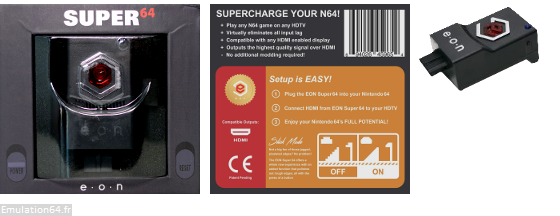 Table des Matières : Présentation Pour Commencer Instructions Générales Mode Slick (Manuel en Anglais - 3 pages) Qu'est ce que le Eon - Super 64 ? Le "Super 64" est un adaptateur qui se branche à l'arrière de la Nintendo 64 et qui va vous permettre de connecter la console à une télévision récente via un cable HDMI. Aperçu du Eon - Super 64 : |