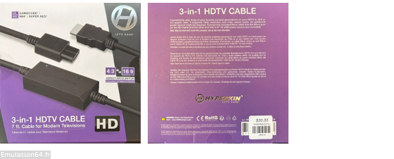 Table des Matières : Guide sur l'Etat du Cable Remarques (Manuel en Français - 3 pages) Qu'est ce que le Hyperkin - 3-In-1 HDTV Cable ? Le "3-In-1 HDTV Cable" est un adaptateur qui se branche à l'arrière de la Nintendo 64 et qui va vous permettre de connecter la console à une télévision récente via un cable HDMI. L'accessoire est également compatible avec les consoles Gamecube et Super Nes. Aperçu du Hyperkin - 3-In-1 HDTV Cable : |