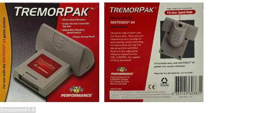 Table des Matières : Caractéristiques Description des Fonctions Précautions (Manuel en Français - 2 pages - Scanné par BFrancois) Qu'est ce que le InterAct - TremorPak ? Le "TremorPak" est un accessoire non officiel qui va vous permettre de faire vibrer votre manette Nintendo 64. C'est l'équivalent du "Rumble Pak" qui est l'accessoire officiel de la console. Aperçu du InterAct - TremorPak : |