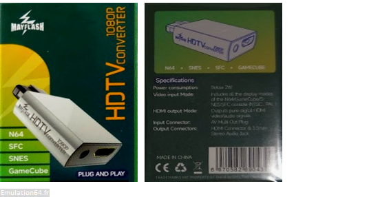 Table des Matières : Introduction How To Work Specifications Notes (Manuel en Anglais - 2 pages) Qu'est ce que le Mayflash - N64-GameCube-SNES-SFC To HDMI Converter ? Le "N64-GameCube-SNES-SFC To HDMI Converter" est un adaptateur qui se branche à l'arrière de la Nintendo 64 et qui va vous permettre de connecter la console à une télévision récente via un cable HDMI. L'accessoire est également compatible avec les consoles Gamecube, Super Nes et Super Famicom. Aperçu du Mayflash - N64-GameCube-SNES-SFC To HDMI Converter : |