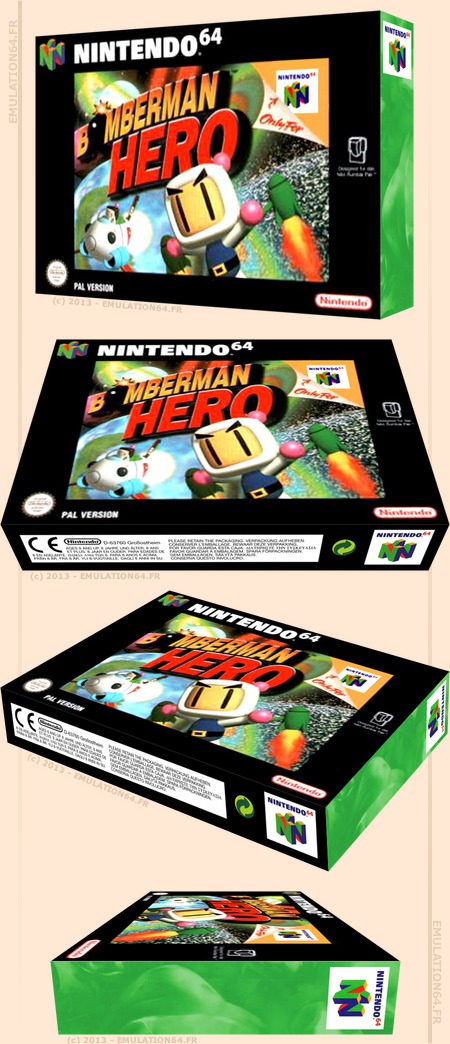 Bomberman Hero : Informations : Plate-forme : Nintendo 64 (N64) Etat du jeu : Disponible Date de sortie française : 1998 Août 1998 (USA) Genre : Action/Plates-formes Jouable uniquement en solo Développeur : Hudson Soft Editeur : Nintendo Jeu également connu sous le Nom : Bomberman Hero - Mirian Oujo wo Sukue |