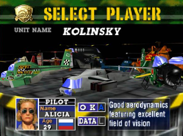 Chopper Attack : Informations : Plate-forme : Nintendo 64 (N64) Etat du jeu : Disponible Date de sortie française : 15 septembre 1998 17 juin 1998 (USA) - 28 novembre 1997 (JAP) Genre : Shoot them up Jouable uniquement en solo Développeur : SETA Corporation Editeur : Midway Jeu également connu sous le Nom : Wild Choppers |