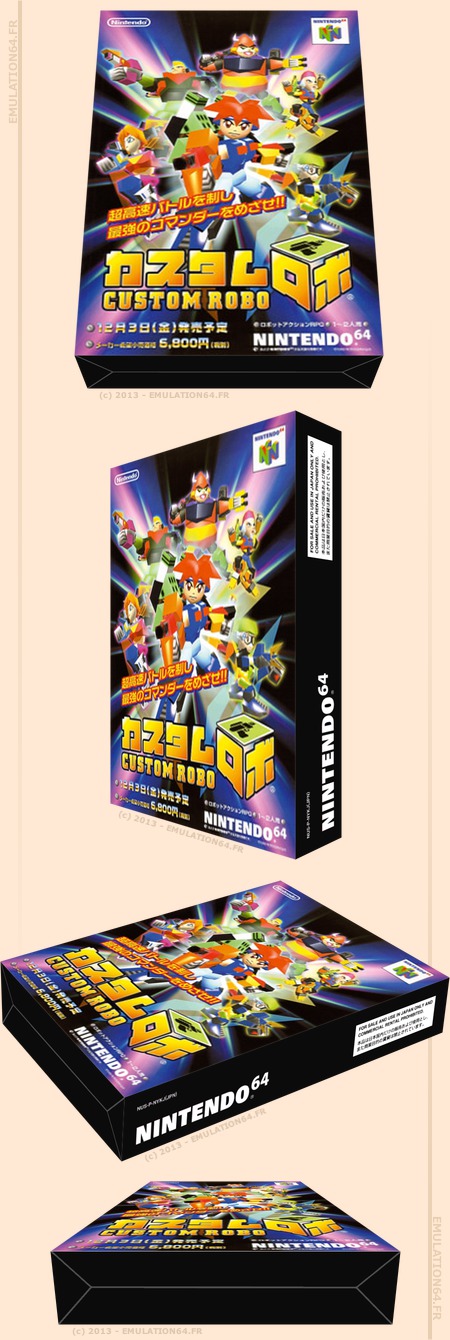 Custom Robo : Informations : Plate-forme : Nintendo 64 (N64) Etat du jeu : Exclusivement import Date de sortie française : n/c 8 décembre 1999 (Japon) Genre : Gestion/Combat Thème : Futuriste/Robots Multijoueur : 1 à 2 Développeur : Noise Editeur : Nintendo |