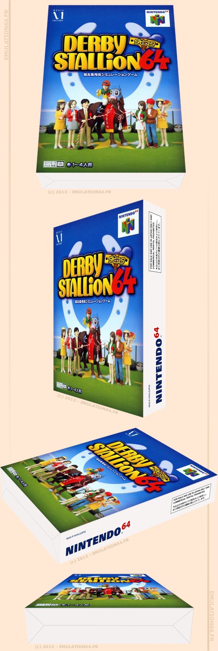 Derby Stallion 64 : Informations : Plate-forme : Nintendo 64 (N64) Etat du jeu : Exclusivement import Date de sortie française : n/c 10 août 2001 (Japon) Genre : Equitation Jouable uniquement en solo Développeur : Parity Bit Editeur : Media Factory |