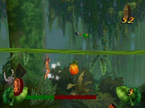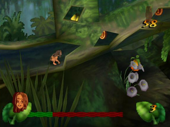 Le jeu commence avec un niveau dans la jungle où Tarzan doit sauver un gorille nommé Terk. Le joueur doit sauter, courir et grimper pour éviter les obstacles tels que les lianes et les arbres. Le gameplay est assez simple et intuitif, avec des commandes de base pour sauter, attaquer et courir. Le jeu comporte également des mécaniques de glisse et de nage, ce qui permet au joueur de varier son approche et de découvrir de nouveaux chemins.