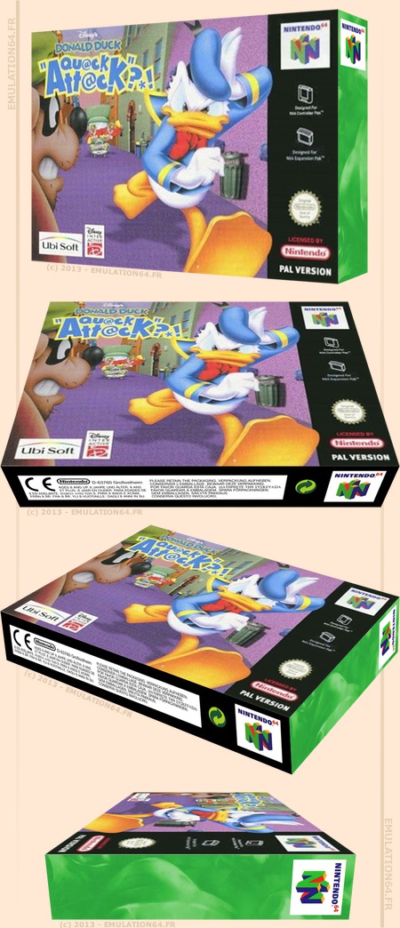 Donald Duck - Quack Attack : Informations : Plate-forme : Nintendo 64 (N64) Etat du jeu : Disponible Date de sortie française : Décembre 2000 13 décembre 2000 (USA) Genre : Plates-formes Jouable uniquement en solo Développeur : Disney Interactive Studios Editeur : Ubisoft Jeu également connu sous le Nom : Disneys Donald Duck - Goin Quackers |