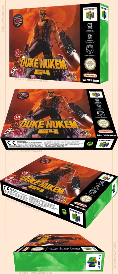 Duke Nukem 64 : Informations : Plate-forme : Nintendo 64 (N64) Etat du jeu : Disponible Date de sortie française : 1997 14 novembre 1997 (USA) Genre : FPS Multijoueur : 1 à 4 Développeur : Eurocom Editeur : GT Interactive Software Distributeur : GT Interactive Software |