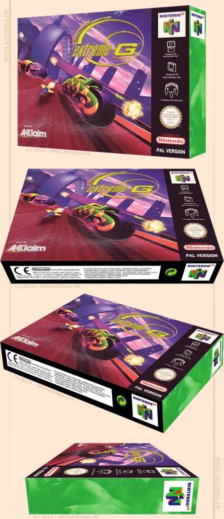 Extreme-G : Informations : Plate-forme : Nintendo 64 (N64) Etat du jeu : Disponible Date de sortie française : n/c 25 octobre 1997 (USA) Genre : Course/Action Thème : Futuriste Multijoueur : 1 à 4 Développeur : Probe Software Editeur : Acclaim Entertainment Distributeur : Acclaim Entertainment |