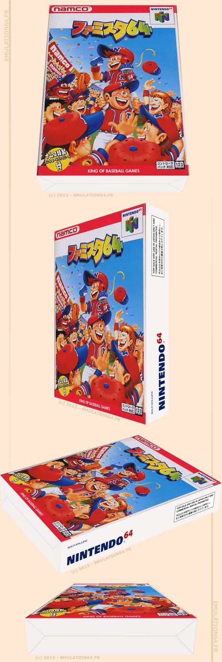 Famista 64 : Informations : Plate-forme : Nintendo 64 (N64) Etat du jeu : Exclusivement import Date de sortie française : n/c 28 novembre 1997 (Japon) Genre : Sport Thème : Baseball Multijoueur : 1 à 2 Développeur : Namco Editeur : Namco |
