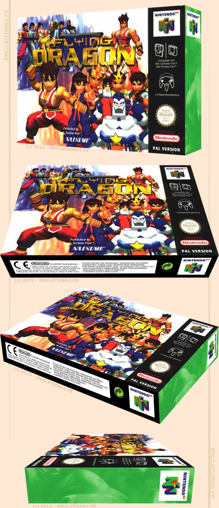 Flying Dragon : Informations : Plate-forme : Nintendo 64 (N64) Etat du jeu : Disponible Date de sortie française : 1998 1998 (USA) - 1997 (Japon) Genre : Combat Multijoueur : 1 à 2 Editeur : Natsume Jeu également connu sous le Nom : Hiryuu no Ken Twin |