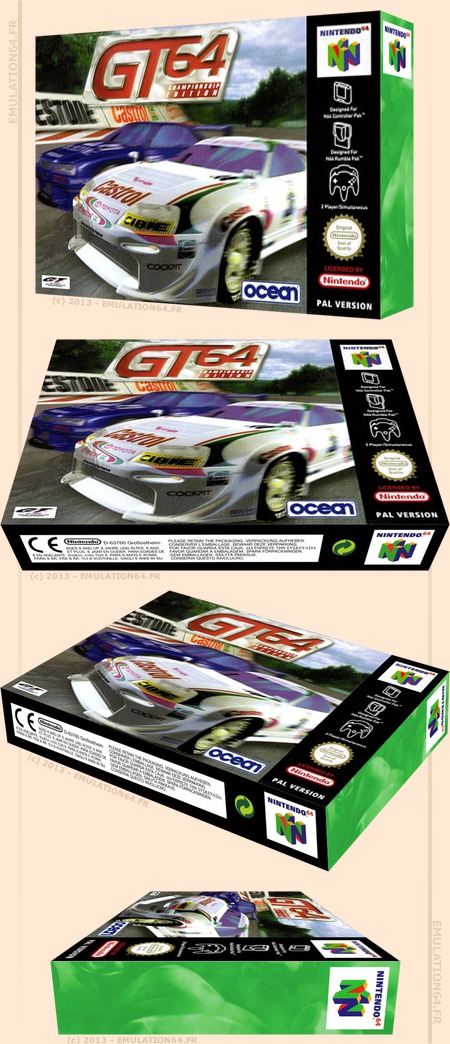 GT 64 - Championship Edition : Informations : Plate-forme : Nintendo 64 (N64) Etat du jeu : Disponible Date de sortie française : 14 avril 1998 9 septembre 1998 (USA) - 30 octobre 1998 (Japon) Genre : Course Thème : Automobile Multijoueur : 1 à 2 Développeur : Imagineer Editeur : Ocean Jeu également connu sous le Nom : City-Tour GP - Zennihon GT Senshuken |