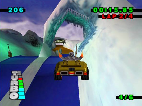 En termes de gameplay, le jeu est rapide et fluide, avec des commandes intuitives qui rendent la conduite facile à prendre en main. Les courses sont souvent très serrées, avec des concurrents agressifs et des obstacles à éviter, ce qui rend chaque course imprévisible.