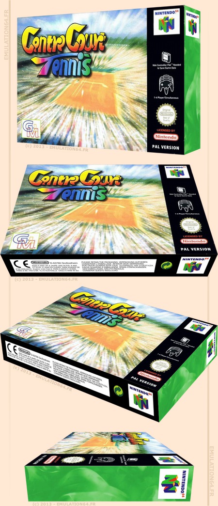 Let's Smash Tennis : Informations : Plate-forme : Nintendo 64 (N64) Etat du jeu : Disponible Date de sortie française : n/c 1998 (USA) Genre : Sport Thème : Tennis Multijoueur : 1 à 4 Développeur : Hudson Soft Editeur : Hudson Soft Jeu également connu sous le Nom : Centre Court Tennis |