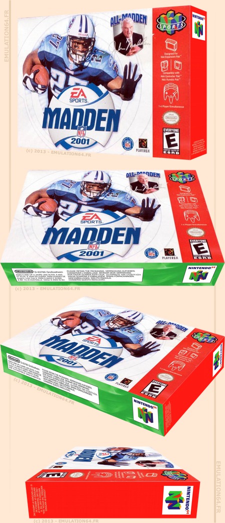 Madden NFL 2001 : Informations : Plate-forme : Nintendo 64 (N64) Etat du jeu : Exclusivement import Date de sortie française : 2000 Août 2000 (USA) Genre : Sport Thème : Football américain Multijoueur : 1 à 4 Développeur : EA Sports Editeur : Electronic Arts |