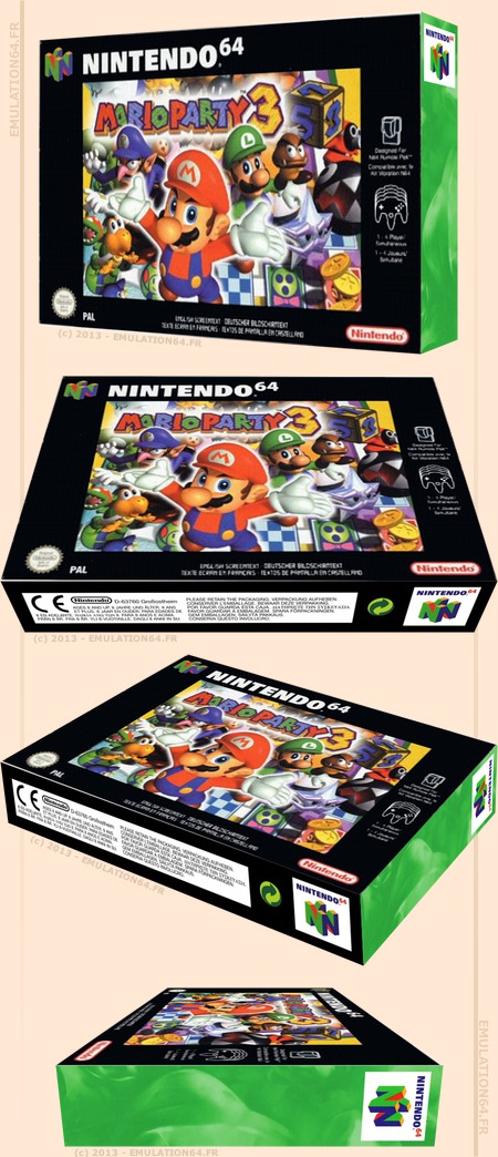 Mario Party 3 : Informations : Plate-forme : Nintendo 64 (N64) Etat du jeu : Disponible Date de sortie française : Novembre 2001 6 mai 2001 (USA) - Janvier 2001 (Japon) Genre : Party game Thème : Mini-jeux Multijoueur : 1 à 4 Développeur : Hudson Soft Editeur : Nintendo |