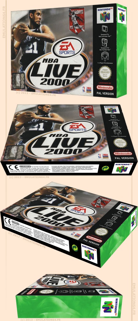 NBA Live 2000 : Informations : Plate-forme : Nintendo 64 (N64) Etat du jeu : Disponible Date de sortie française : 1999 17 novembre 1999 (USA) Genre : Sport Thème : Basketball Multijoueur : 1 à 4 Développeur : NuFX, Inc. Editeur : EA Sports |