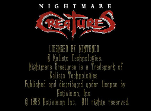 Nightmare Creatures : Informations : Plate-forme : Nintendo 64 (N64) Etat du jeu : Exclusivement import Date de sortie française : n/c 1997 (USA) Genre : Action-Aventure Thème : Horreur Jouable uniquement en solo Développeur : Kalisto Entertainment Editeur : Activision |