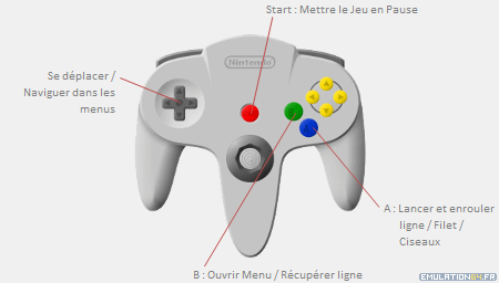 Comment Jouer ![]() Si vous souhaitez obtenir plus d'informations sur les commandes de Nushi Tsuri 64, vous pouvez consulter le Manuel du Jeu.