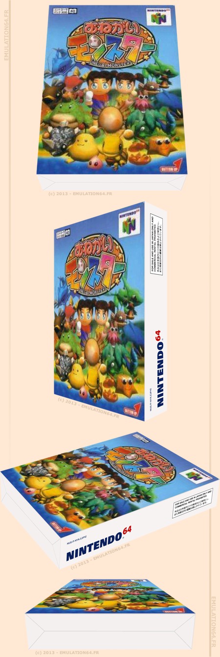 Onegai Monsters : Informations : Plate-forme : Nintendo 64 (N64) Etat du jeu : Exclusivement import Date de sortie française : n/c 9 avril 1999 (Japon) Genre : Jeu de rôles Jouable uniquement en solo Développeur : Bottom Up Editeur : Bottom Up |