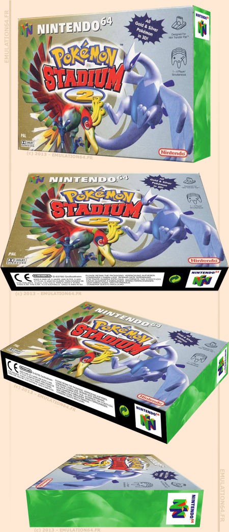 Pokemon Stadium 2 : Informations : Plate-forme : Nintendo 64 (N64) Etat du jeu : Disponible Date de sortie française : 18 octobre 2001 26 mars 2001 (USA) - 14 décembre 2000 (Japon) Genre : Stratégie tour par tour/Combat Thème : Collection de monstres Multijoueur : 1 à 4 Développeur : HAL Laboratory Editeur : Nintendo Jeu également connu sous le Nom : Pocket Monsters Stadium Kin Gin |