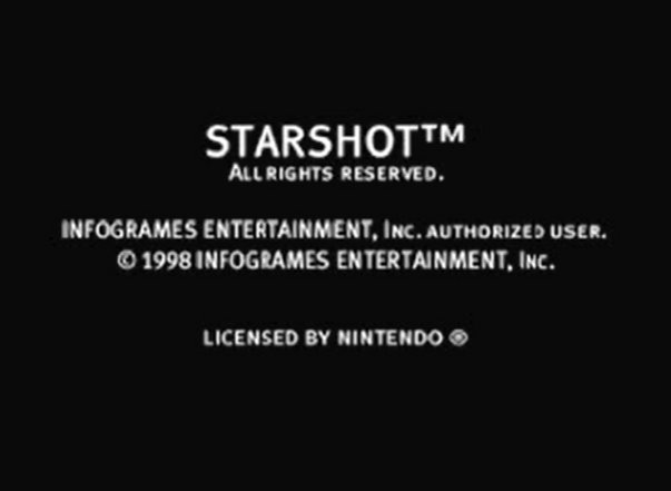 Starshot - Panique au Space Circus : Informations : Plate-forme : Nintendo 64 (N64) Etat du jeu : Disponible Date de sortie française : 1998 1999 (USA) Genre : Plates-formes Jouable uniquement en solo Développeur : Atari (Infogrames) Editeur : Atari (Infogrames) Jeu également connu sous le Nom : Starshot - Space Circus Fever |