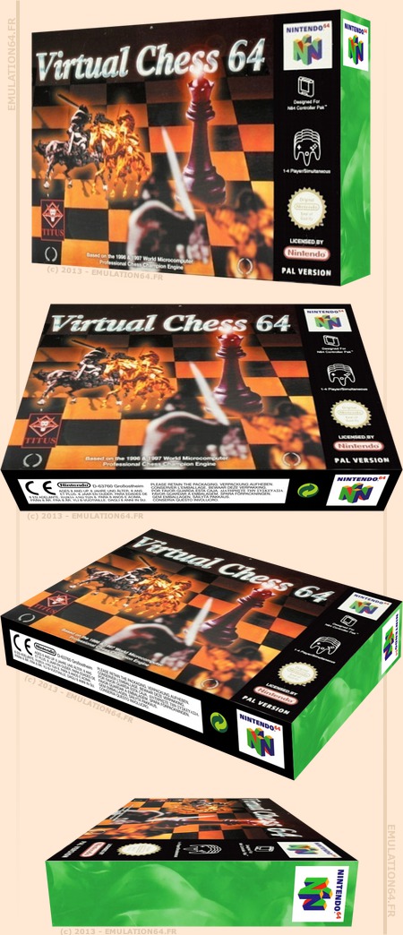 Virtual Chess 64 : Informations : Plate-forme : Nintendo 64 (N64) Etat du jeu : Disponible Date de sortie française : n/c 1998 (USA) Genre : Jeu de société, hasard Thème : Echecs Multijoueur : 1 à 2 Développeur : Titus Editeur : Titus |