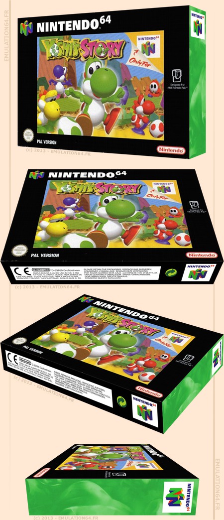 Yoshi Story : Informations : Plate-forme : Nintendo 64 (N64) Etat du jeu : Disponible Date de sortie française : 1998 1998 (USA) - 1997 (Japon) Genre : Plates-formes Jouable uniquement en solo Développeur : Nintendo Editeur : Nintendo Jeu également connu sous le Nom : Yoshi's Story |