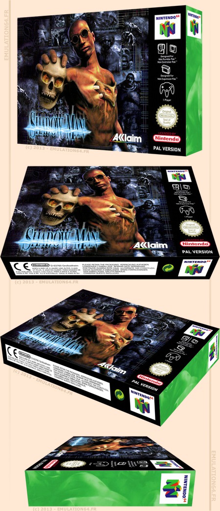 Shadow Man : Informations : Plate-forme : Nintendo 64 (N64) Etat du jeu : Disponible Date de sortie française : Septembre 1999 31 juillet 1999 (USA) Genre : Action-Aventure Jouable uniquement en solo Développeur : Acclaim Studios Teeside Editeur : Acclaim Entertainment |