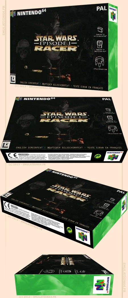 Star Wars Episode I - Racer : Informations : Plate-forme : Nintendo 64 (N64) Etat du jeu : Disponible Date de sortie française : 17 mai 1999 1999 (USA) Genre : Course Thème : Futuriste Multijoueur : 1 à 2 Développeur : LucasArts Entertainment Editeur : Nintendo Distributeur : Nintendo |